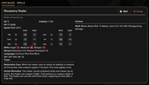 Monastery Healer (CR 1): Devoted caretaker trained in restorative medicine and spiritual care for pilgrims and residents.
