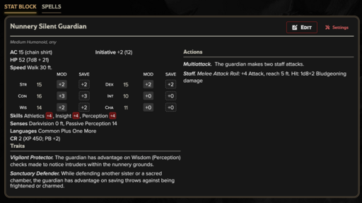 Nunnery Silent Guardian (CR 2): Disciplined defender trained to protect the convent and the sacred relics under its care.