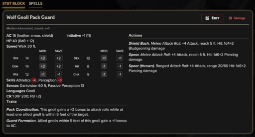 Wolf Gnoll Pack Guard (CR 1): Defensive warrior who protects the pack’s territory and maintains formation discipline in battle.