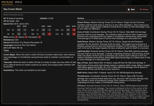 Sea Coven Witch (CR 5): Tide-touched spellcaster who commands waves, currents, and drowning magic.