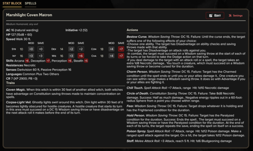 Marshlight Coven Matron (CR 7): Experienced marsh witch who manipulates fear, darkness, and flickering lights to mislead enemies.