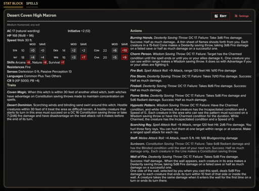 Desert Coven Witch (CR 5): Dune spellcaster wielding mirages, scorching winds, and blinding sand.