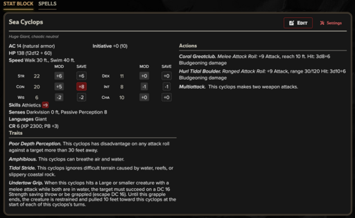 Sea Cyclops (CR 6): Amphibious shoreline hunter that attacks from surf, reefs, and rocky coasts.
