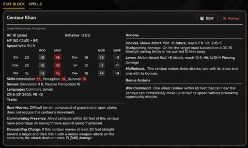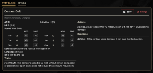 Centaurs represent a civilization shaped by distance and movement. Their settlements are temporary, their alliances pragmatic, and their power measured in territory rather than walls. Use these stat blocks to represent migrating clans, roaming warbands, or the disciplined cavalry of a great steppe empire.