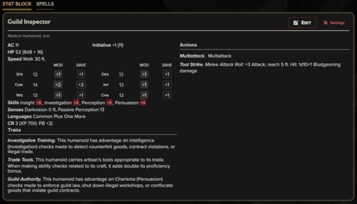 Cultural detail is intentionally minimal. Whether these guilds cooperate, compete for influence, or quietly manipulate civic leadership is left to the GM. Merchant authorities may clash with religious doctrine, traveling performers may influence politics through public sentiment, and monastic orders may pursue discipline that few outsiders truly understand. These stat blocks provide the framework. How these institutions shape the city is your story to tell.