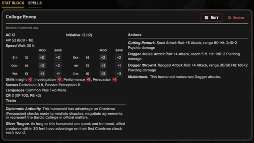 College Envoy (CR 3): Diplomatic bard representing the college in political or cultural negotiations.
