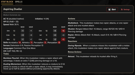 Lore surrounding the corps is intentionally minimal. Whether these musketeers serve a benevolent crown, a corrupt monarchy, or a fractured noble state is left to the GM. The rivalries, loyalties, and politics that shape their actions are tools for your campaign. Use these stat blocks as flexible agents of authority, honor, ambition, or intrigue.