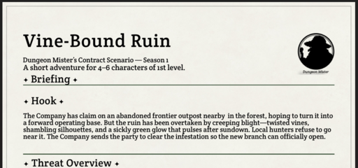 This compact, two‑page Contract Scenario provides a focused, table‑ready mission supported by a full battle map of the ruin. Designed for quick prep and flexible use, it fits easily into ongoing campaigns or can stand alone as a short, self‑contained excursion for low‑level parties.