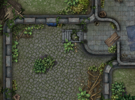 A compact two‑page adventure paired with a fully prepared 28×21 battle map of an overgrown ruin reclaimed by vines and debris.