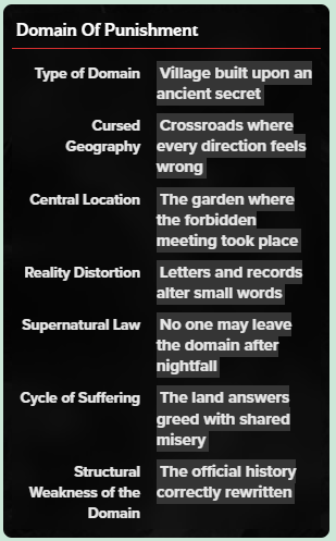 Defines the overall nature of the cursed territory, from villages and manors to graveyards, monasteries, ruins, cities, and isolated landscapes.
