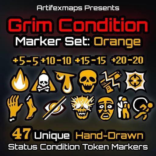 Grim Condition Marker Set contains 47 hand-drawn Status Markers in ORANGE