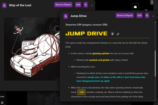 After making the final jump, the players' ship finds themselves in the proximity of a compact but active black hole. There are no jump cores left. All they observe is a very old hyper beacon, a cloud of debris, and the Ship of the Lost - a giant drifting structure assembled from dozens of other ships.