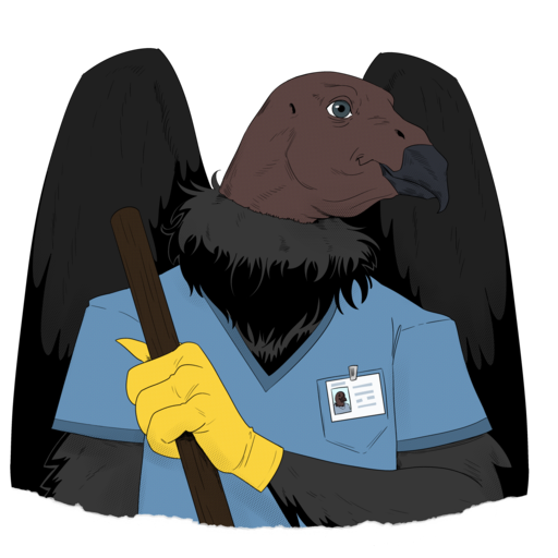 Condor, a vulture-headed individual with black wings and feathers. They are wearing blue scrubs and yellow gloves, have an ID badge clipped to their pocket, and are holding a wooden broom handle.