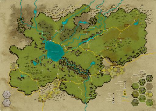 Elevation map, showing the highlands, lowlands, and water flow throughout Dolmenwood.