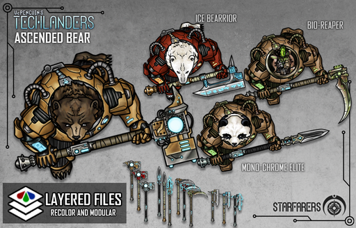 Techlanders supporters have access to prepositioned art files for modular custom tokens. Roll20 customers have access to the separated elements that can be downloaded, layered and positioned in your preferred art program, and saved as a custom .png token. The weapons, body parts, heads, etc. can can be mixed and matched with separated elements from other packs as well, allowing greater modification of tokens as the story progresses.