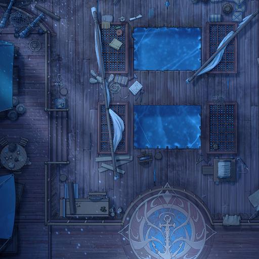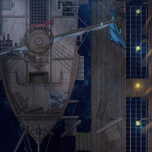 Pirates and adventure await in this map pack! Or perhaps it's bureaucracy and a lot of down time as their ship is repaired. Featuring docks, boats, green water, and the catch of the day, this is a perfect location for sailors. Does a notorious pirate crew run this place? Or perhaps a cult with ties to ancient sea gods. The variants provide a myriad of choices, including an abandoned dock, a sea of blood, and even a dried up ocean desert. There's even a variant in the sky for your airships or Spelljammer campaign. With the ghosts haunting the docks at night, though, we wouldn't recommend staying too long. Though the sunset is certainly a sight to behold!