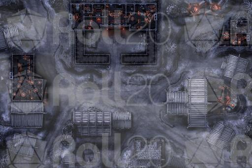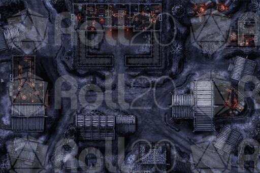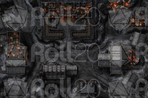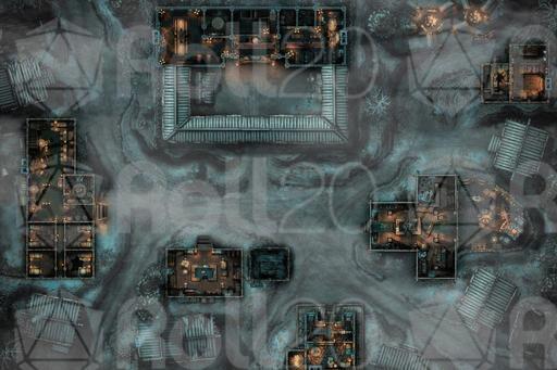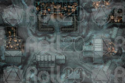Barracks & Jail: The largest building has fortifications surrounding it, a gallows, and a mess hall and quarters for the town guard. Below, underground, is a jail for anyone causing trouble.