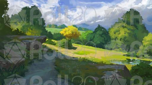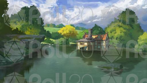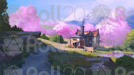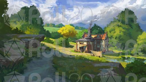 The scene depicts a pastoral setting where the village forge, workshops, and country road converge. A wooden bridges spans a quiet stream. Birds swim in the tranquil pond. Seasonal and weather variants give your worldbuilding depth and allow you to bring your party back to this location time and time again. Is there a wise NPC who works this forge? Or are there deeper mysteries hidden by the peace of rural life?