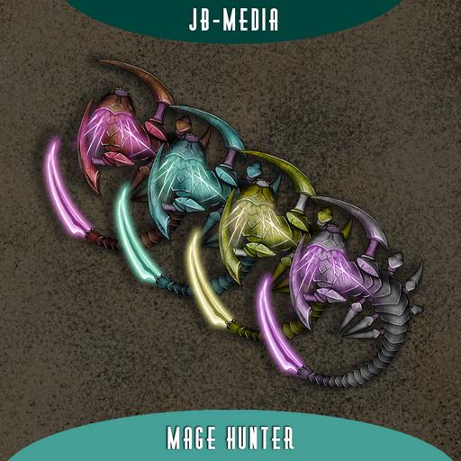 Mage Hunter: This terrifying insectoid predator is specialized in hunting arcane practitioners. With its chitinous armor and lightning-fast reflexes, the Mage Hunter can disrupt spellcasting and leap great distances to capture its prey. Its tokens are depicted poised to strike, with antennae twitching and mandibles clacking.