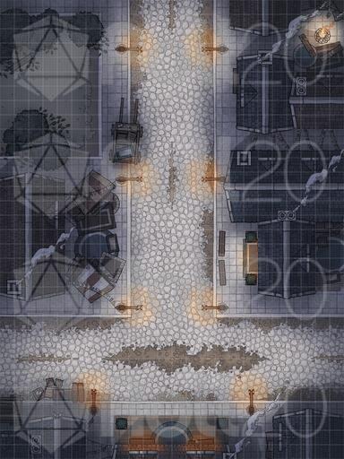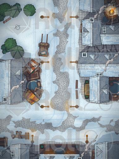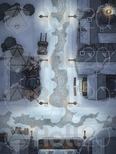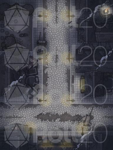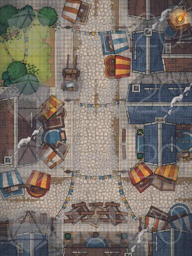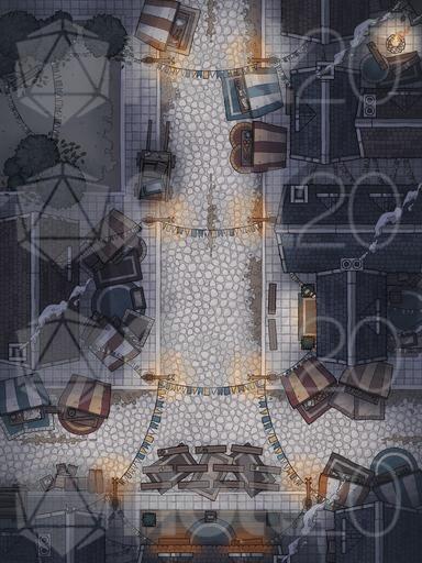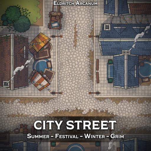 A map pack of a bustling city street, perfect for random encounters, night time post-tavern brawls, and all manner of urban encounters! Variants include a colourful festival, freezing winter, and gloomy grim.