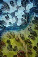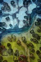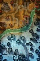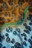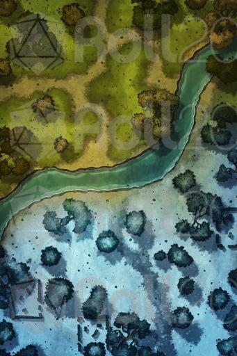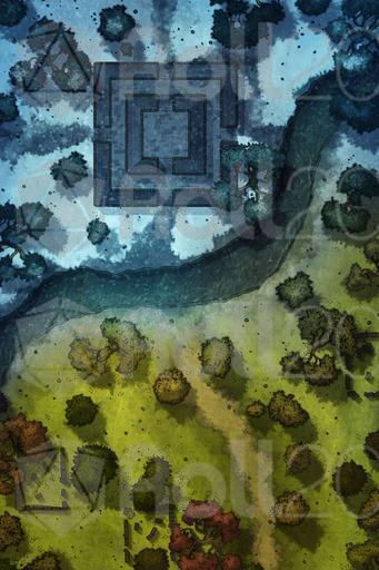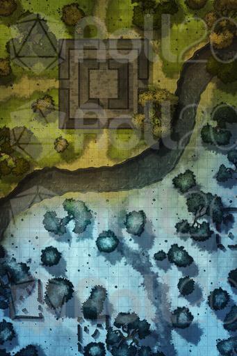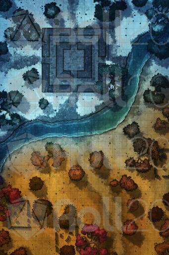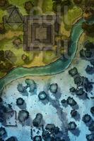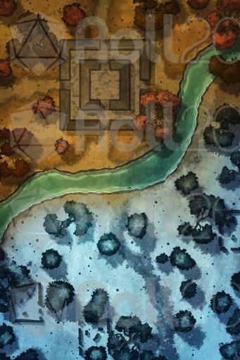 Upon arriving at the ruins, they realize that they are quite destroyed. The only structure still standing is an old ceremonial center where the leaders of the towns that once inhabited this region used to gather. Below, the ruins are less impressive: remnants of houses, scattered stones, and barely visible paths under a white blanket. A river crosses the map from side to side. As they explore the area, they notice ancient inscriptions and fragments of statues, but nothing of immediate great value.
