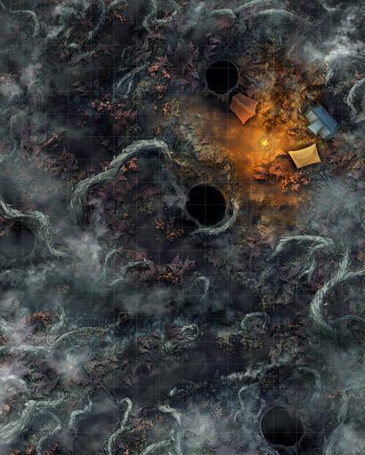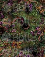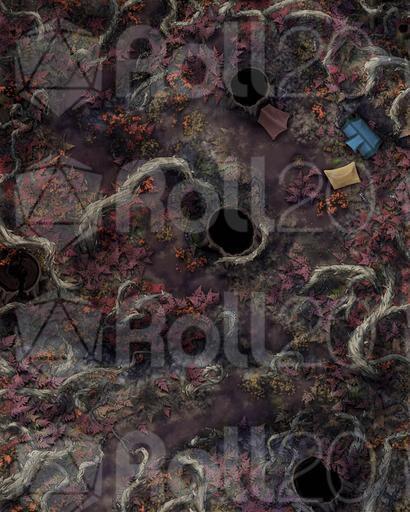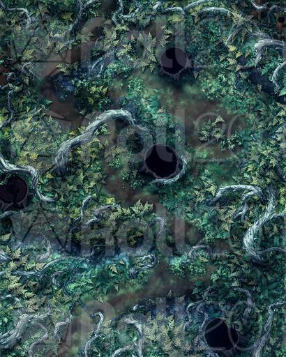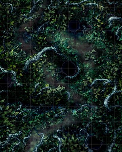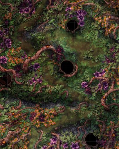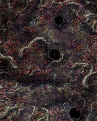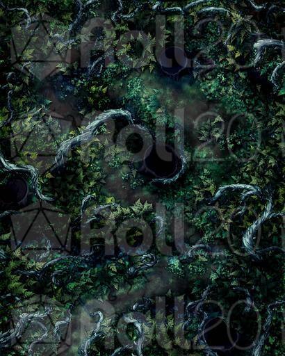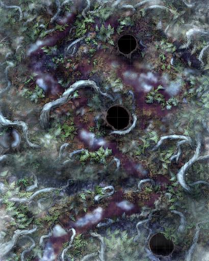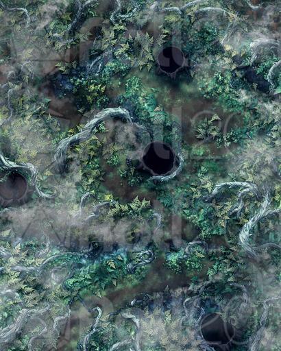 This 16x20 terrain map features a twisting, hilly path between dangerous brambles. For this map set, choose the time of day, weather, and type of curse. Eighteen map versions total.