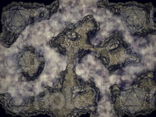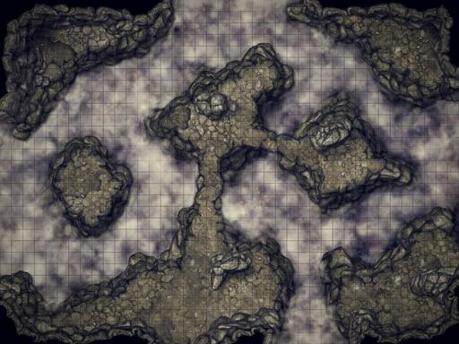 Deep in the mountain, the mist covers the floor of this cave. There are two entrances in the top corners and plenty of places where to hide.