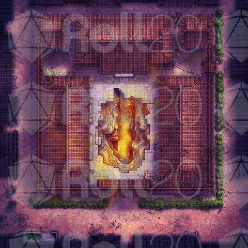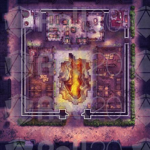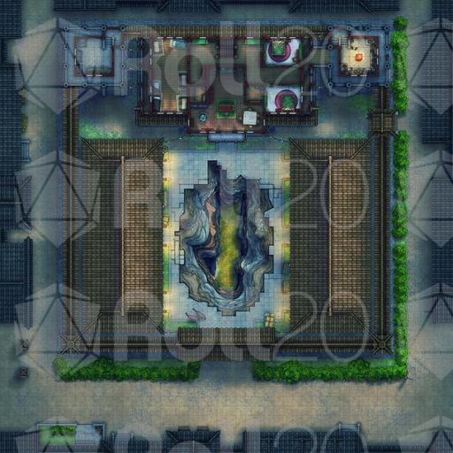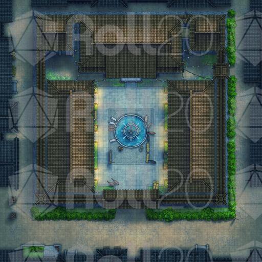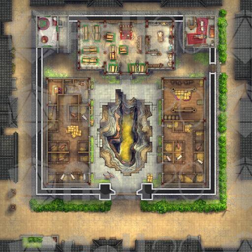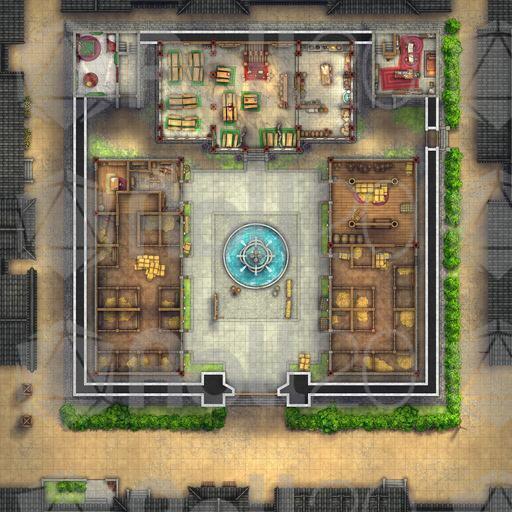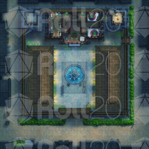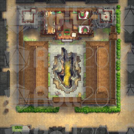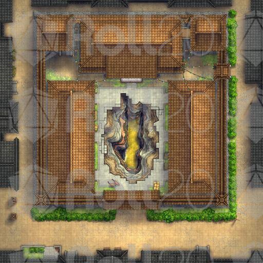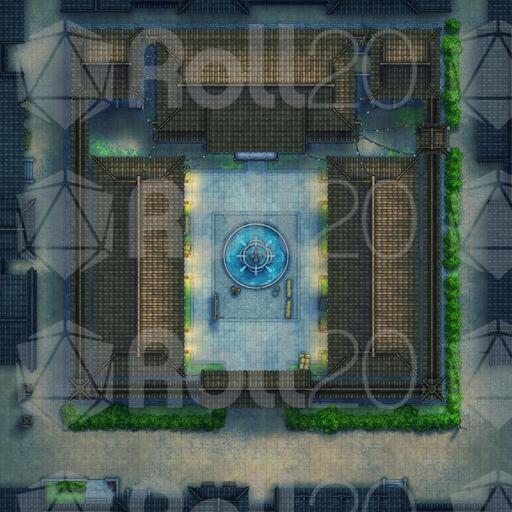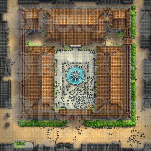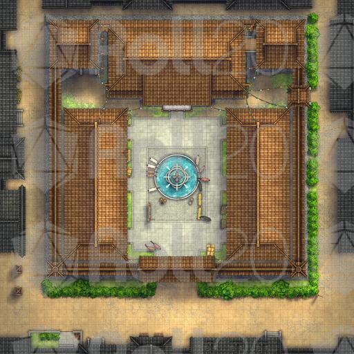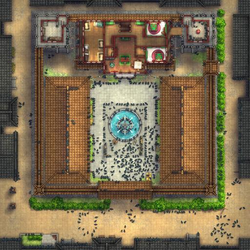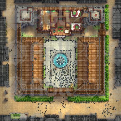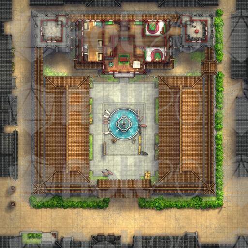 This map is directly compatible with the DnDungeon Modular Japanese City Tileset pack! The left- and right-hand bottom corners line up perfectly for attaching this map to any of the other compatible location maps or street tiles.