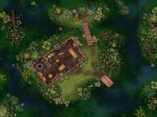 Hidden Cabin: A two-room cabin is hidden away in the deep swamp. A garden out back and a dock up front make it a comfortable home for someone.