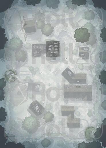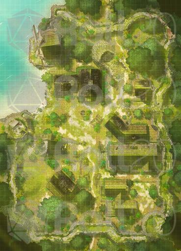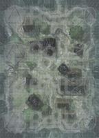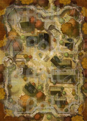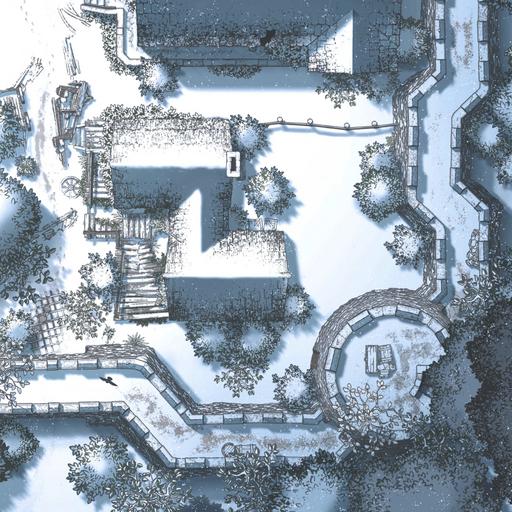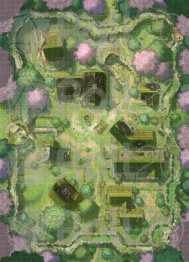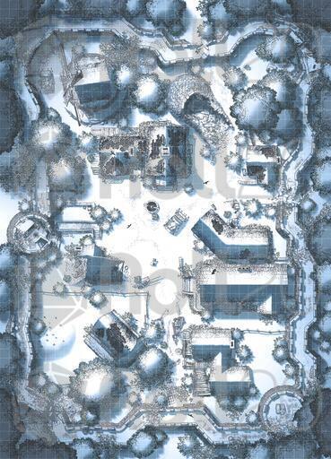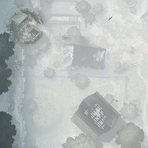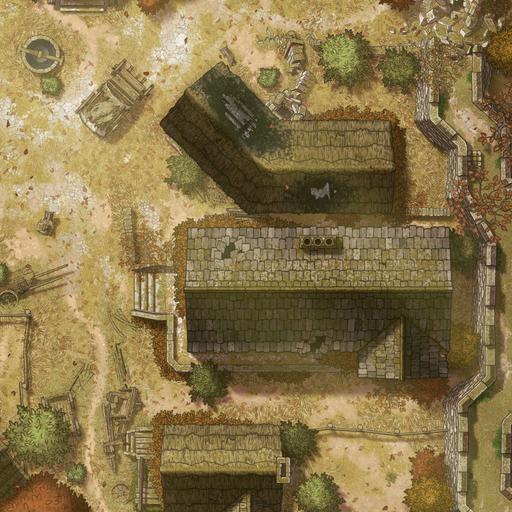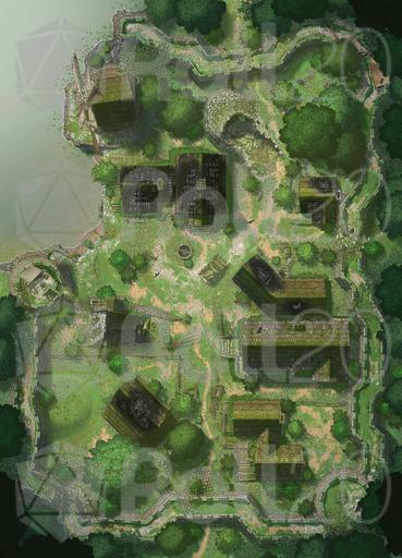 *The dream of Hauthell is dead. Total collapse became unavoidable, and now the ruins of the village and fort are all that remains. Moss has reclaimed the homes, and the crumbled curtain wall means even invaders won’t bother to refortify the former bastion. We’ve added new interiors to this map, including three options for a secret basement, plus ruined versions of the inn and barracks. *