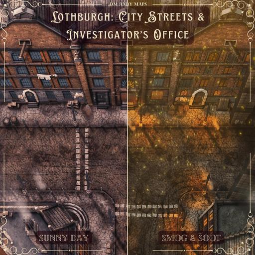 Additionally, I have included the interior of an investigator’s office, making this map the perfect centerpiece for all of your games of intrigue! Maybe your party is running an investigation agency and takes on new clients in the high-backed leather chairs while the city passes them by from the windows. Or maybe your party has been solving murders around town and is now ready to turn their findings into the notable detective on the case.