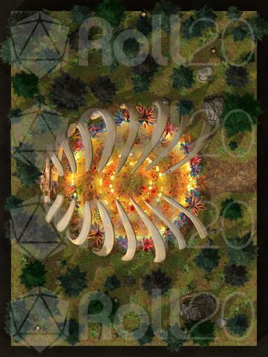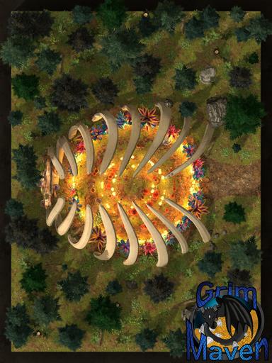 • Bone Cage (Day and Night): A massive rib cage looms over the circle, half-sunk into the earth; the remains of something long dead, now feeding the ritual.