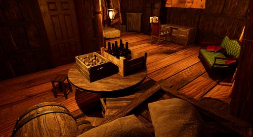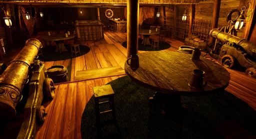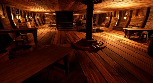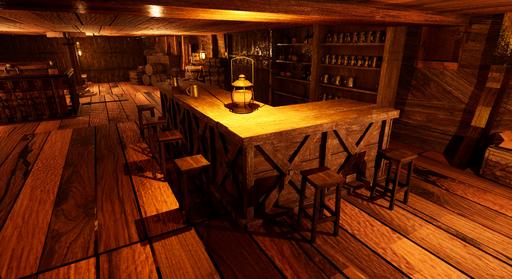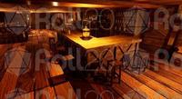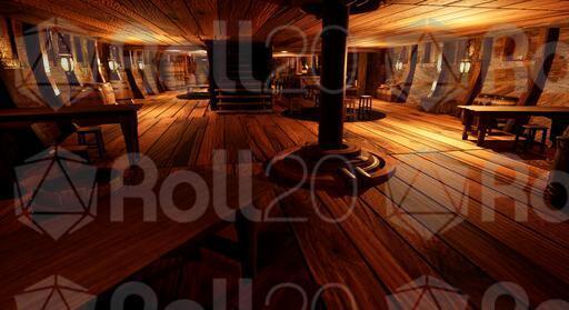 Low Lantern Tavern, a weathered, three-masted ship repurposed as a tavern, anchored to the wharf in Baldur's Gate. As you make your way through the dimly lit streets, the scent of brine and the distant sound of creaking wood guide you. The soft glow of lanterns casts flickering reflections on the murky waters, and the muffled hum of conversation drifts through the air.