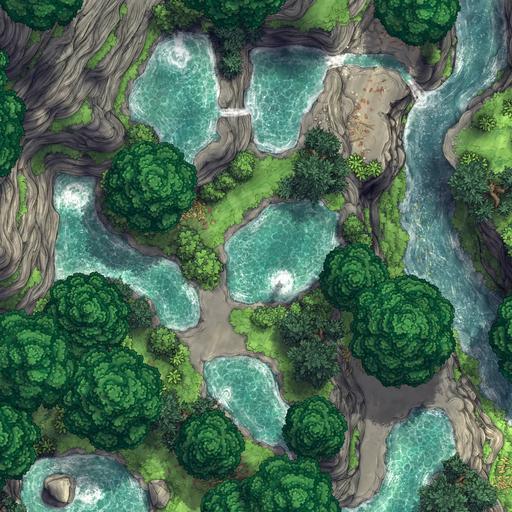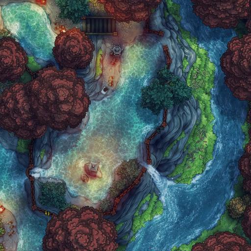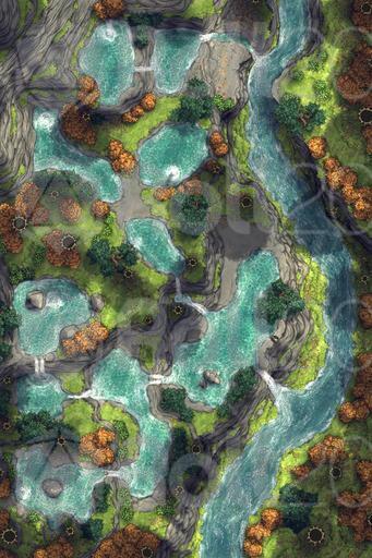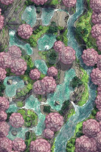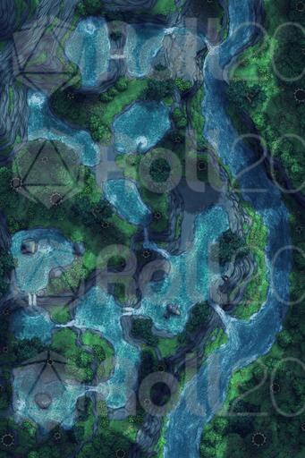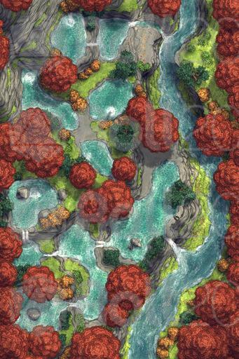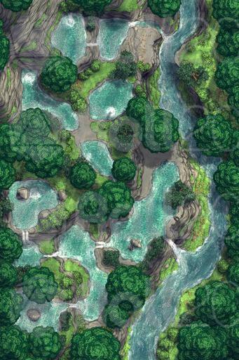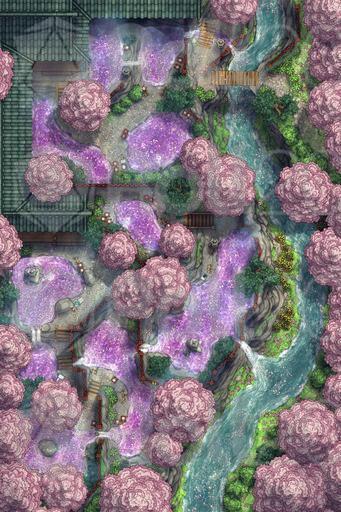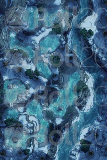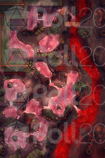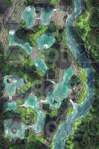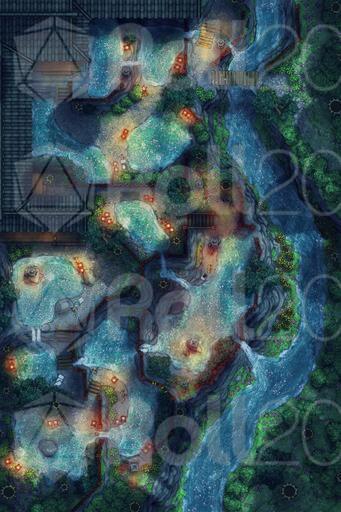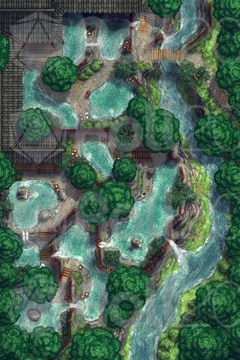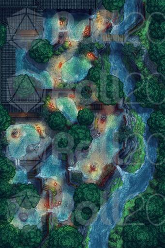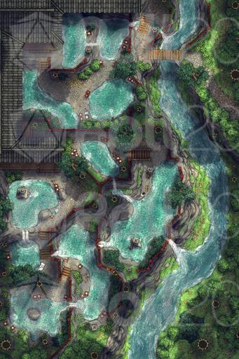 A relaxing mountainside bathhouse battlemap full of narrow winding passages, rocks, pools & carefully-maintained shrubbery for someone to make a mess out of! Alternatives feature a bizarre basalt underworld & a natural hot springs largely free from commercial intervention.