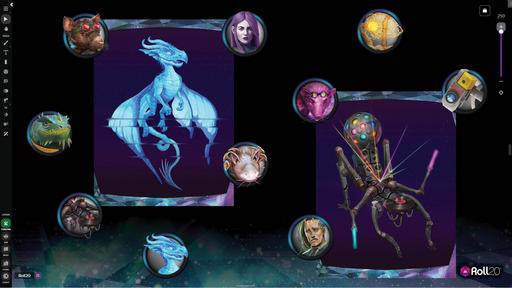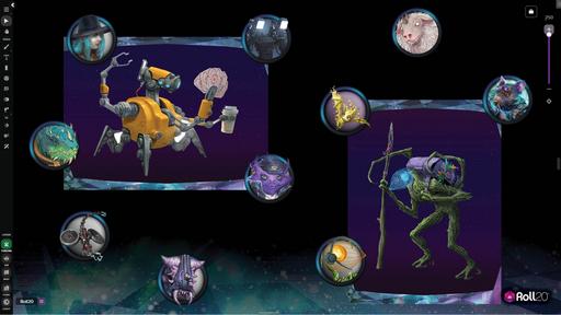 Tokens and Portraits from the Murder in Metal City Art Pack displayed on the Roll20 Virtual Tabletop, including ancestries like Vesk, Ysoki, Anacite, Hardlight Dragonet, Mechanizer, Shroomclaw, Lashunta,Ysoki, Khizar, and SRO.