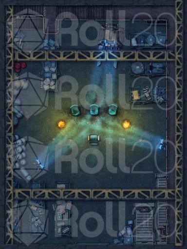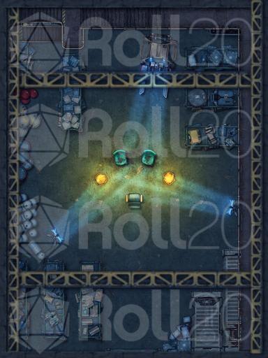 Here’s a grim and gritty map for your modern or cyberpunk campaigns: an interrogation scene hidden deep inside a dark industrial warehouse.