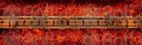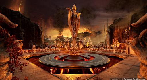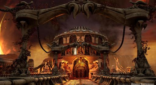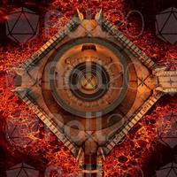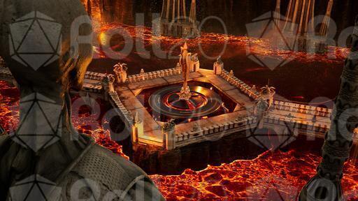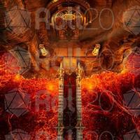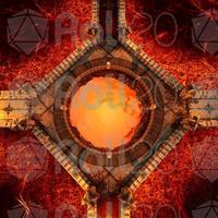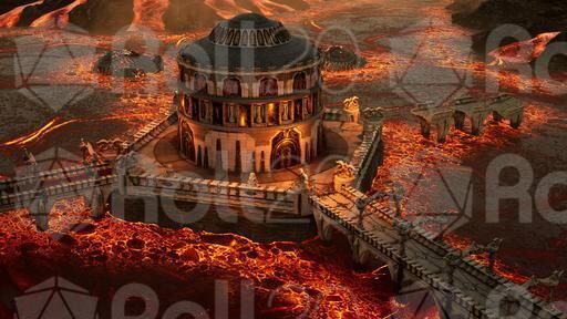 A desolate, fiery realm unfolds beneath a perpetually bruised sky, where paths of ornate stone and statues of silent giants bridge a vast expanse of churning magma. At its heart, an infernal temple stands defiant against the heat, while a great, burning pit glows with a malevolent light. Ancient, golden doors with intricate carvings promise a dark and formidable power within. This is the Molten Court, a fortress built upon hellish flames, where every bridge leads to a greater danger and a shimmering portal beckons travelers toward an even darker abyss.