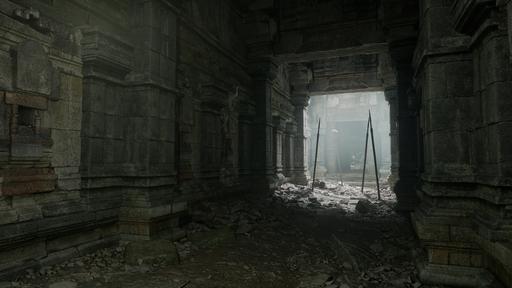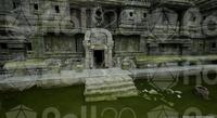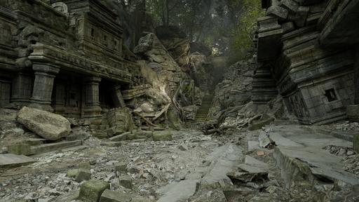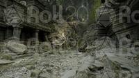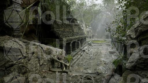 Deep within the jungle, a magnificent temple lies in ruin, its grand architecture and intricate carvings slowly being reclaimed by the wild. A central courtyard, strewn with rubble, leads past crumbling columns and a stagnant, green pool. The path descends into a cavernous chamber, where an immense, serene statue of a reclining figure rests, a single shaft of light illuminating its peaceful face. This is a place of profound age and forgotten lore, where the past is etched into every stone and every root that twists through the debris. It is a monument to a lost civilization, waiting for intrepid adventurers to uncover its secrets.