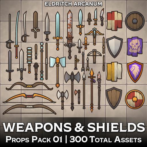 A pack of props focused on weapons and shields, perfect for stocking armouries or inventory pages! Covers a variety of styles, including orcish, dwarfish, elvish, and real world historical weapons like the katana and gladius.