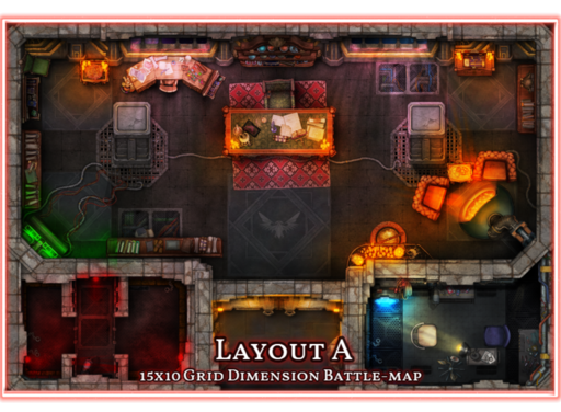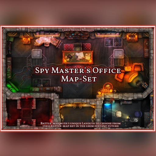 This set contains 15x10 Spy Master's Office Battle-map in five unique layouts. This set contains hand-crafted battle-map, default version has hidden chambers hidden and you may decide from two distinct layouts of hidden chambers what to run for your players! Both Chamber-Layouts also have ''Escalation''-Version included, where the map visuals progress with your narrative and encounter! Check out the Reel-images for previews! Are your players been taken captive by corrupted Spy Master? Or perhaps it is your players doing the questioning, you decide!