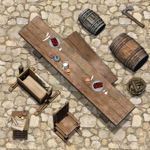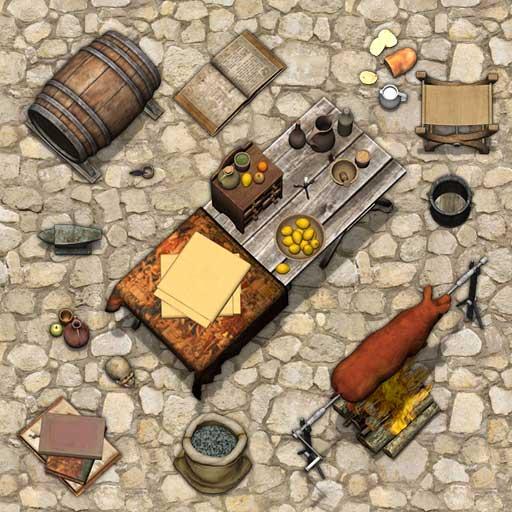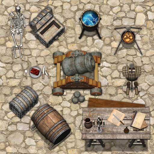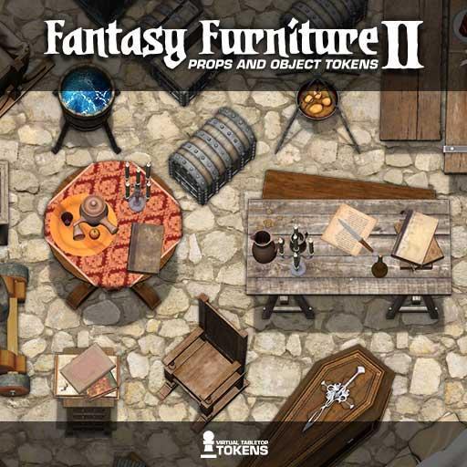 This package is aimed at expanding our first Fantasy Furniture pack with a wealth of new Props and Objects to give Game Masters access to an expanded palette of accessories that can be added into existing adventure maps or employed as an Art Asset pack during map construction. This package continues the fantasy Props and Objects theme with items such as coffins, piles of bones, altars, weapons, as well as mundane tables and chairs.