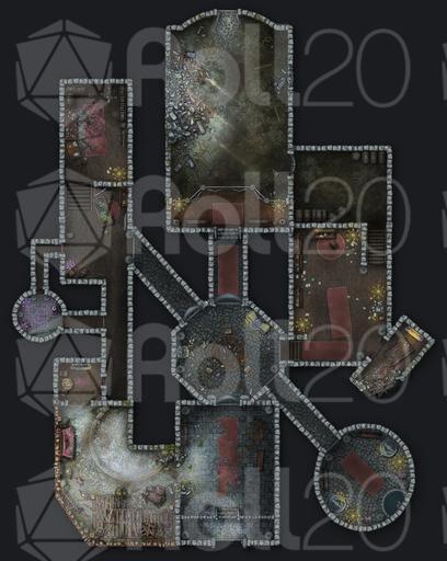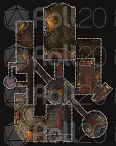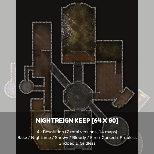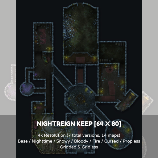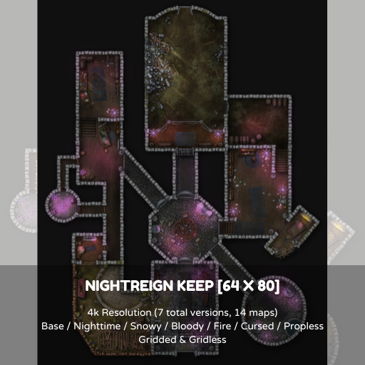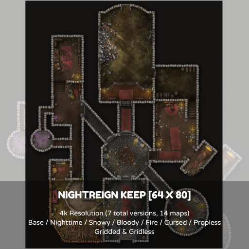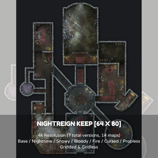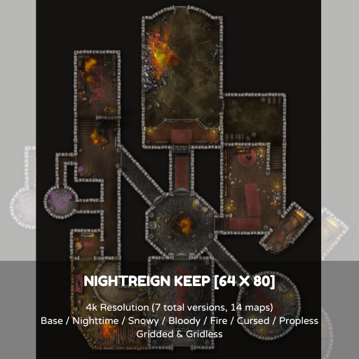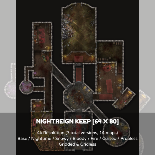 The variants take the keep in strikingly different directions: the first two variants set the mood with a cold nighttime version lit by faint candlelights, or a snowbound keep where frost and silence claim the ruins; the next two variants heightens the danger with a cursed, blood-soaked fortress where crimson stains the stones, or a fire that just began consuming the halls of the keep; and finally, finally, the last two variants offer two extremes—one stripped bare of props to leave room for your creativity and fill it as you wish, and another warped by corruption, glowing with sinister magic as the keep itself becomes a vessel for the curse.