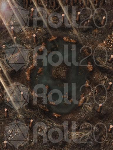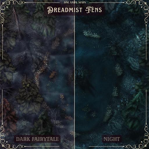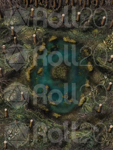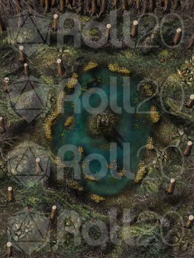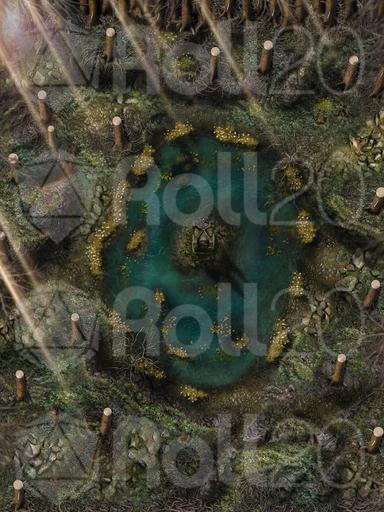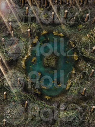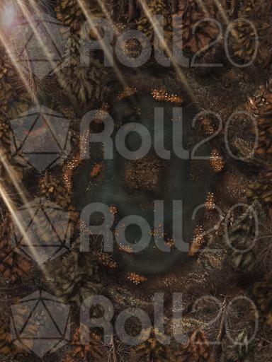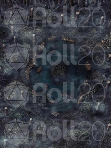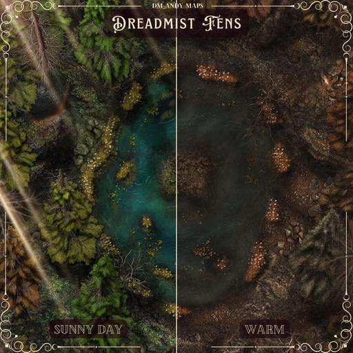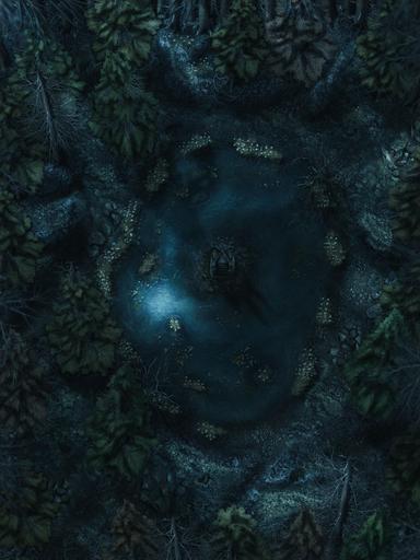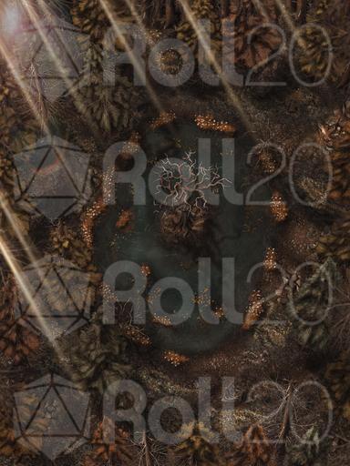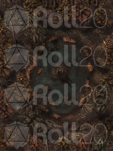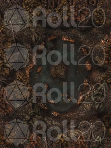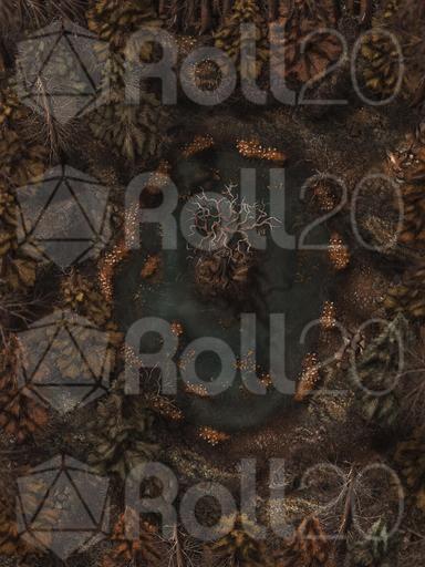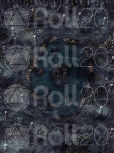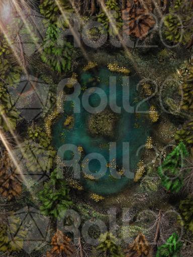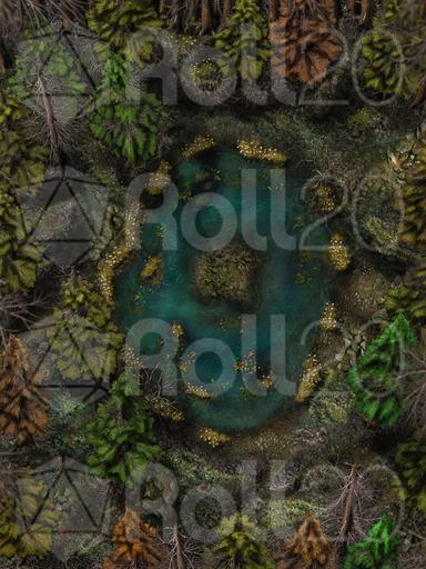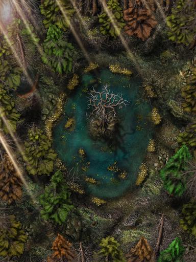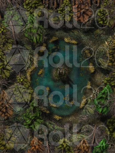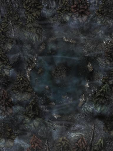 Hi everyone, and welcome to my Dreadmist Fens map release! This 30x40 map features a lush pine forest with a pond containing a small island in the center of it. A great nature map for any type of forest encounter!
