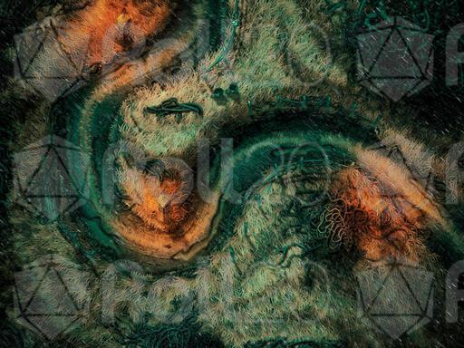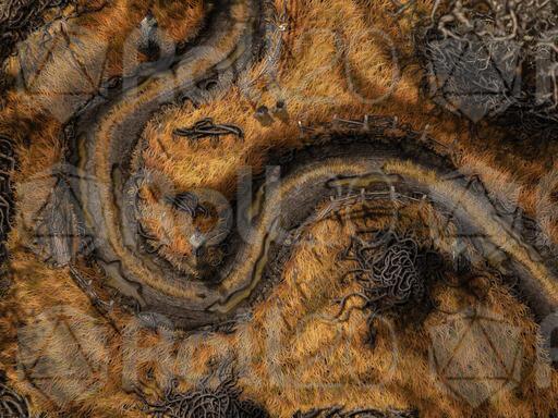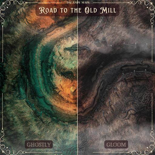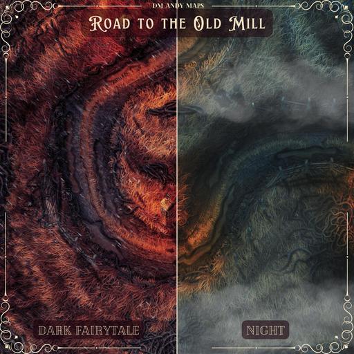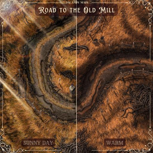 Hi everyone, and welcome to my Road to the Old Mill map release! This 40x30 map features a winding, dirty, and muddy road twisting through hills of swaying grass and thorny brambles. In the distance, your party can spot a decrepit windmill on a lone hill about a mile out, almost taunting them to investigate.