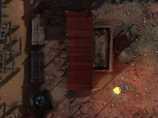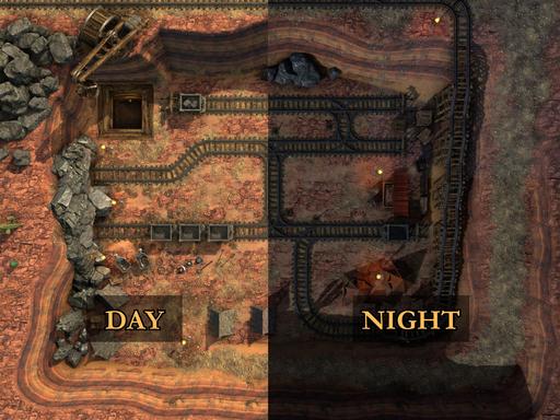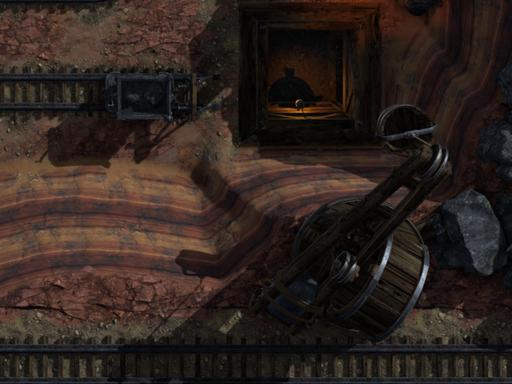 Details: Tracks, mine shafts, carts, tents, and rocky terrain
