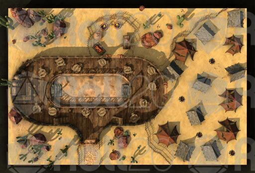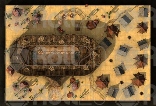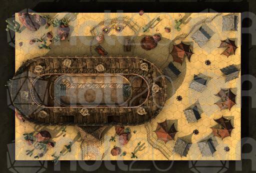 Not all taverns are fancy brick-built luxurious watering holes in the middle of a cosmopolitan city, or a well-known alehouse in the heart of Dwarven culture. Sometimes, all you need is some spare wood, some canvas and a dream! So come on down to The Oasis, a ramshackle wooden construction in the middle of a stretch of desert, where you can come and relax during your journey. Features a built in fighting pit for those looking to test their skills! If you want a room, well, they have lots for rent out back for your tent; no cushy bed for the barbarian lifestyle, sonny!