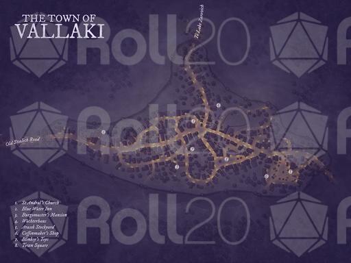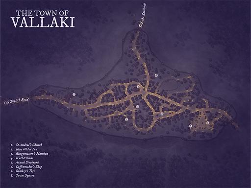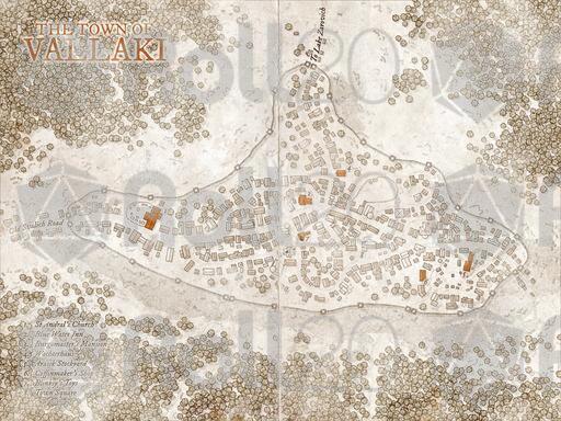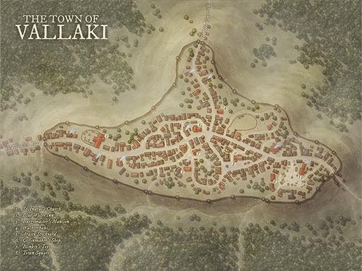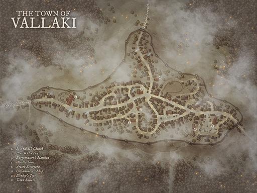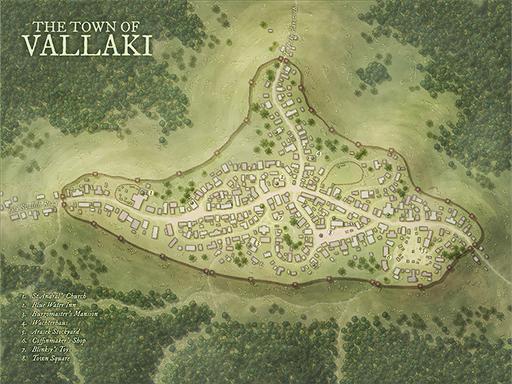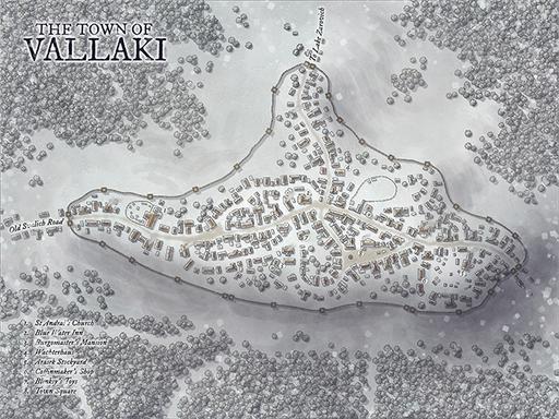 Vallaki sits cradled in a low valley where the road from the Svalich Woods widens into a broad, mud-stitched plain. From a distance it looks defensible: a stout wooden palisade crowns the ridge, watch-towers punctuate the wall, and the town’s clustered roofs tumble down toward a central square. Fog clings to the outer fields like an uninvited guest, pressing at the gates and promising that whatever lies beyond the palisade is not meant to be taken lightly.