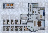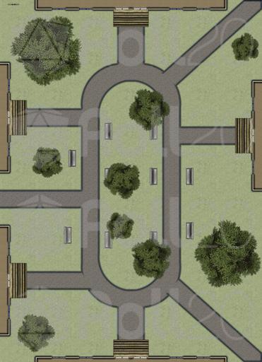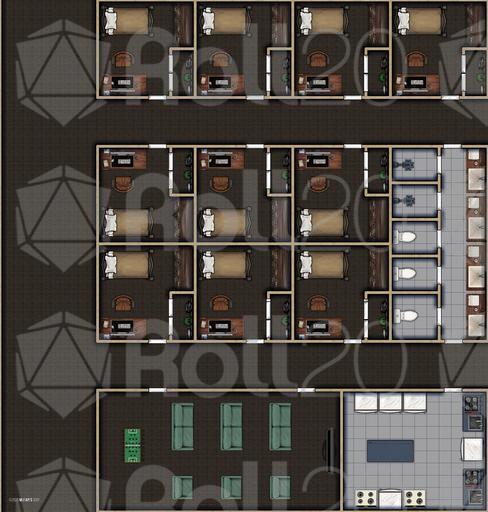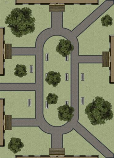 University: Campus courtyard, classrooms, dorms, lecture hall, library, professor's office, student lab, student lounge, admin