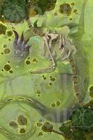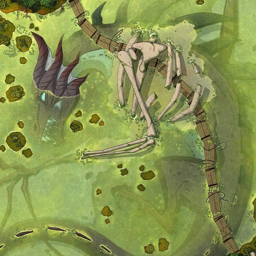 ➤ Dragon Rot. [20x30] A dragon corpse lies bloated and decaying in this swamp thoroughfare, threaded with a wooden bridge for travellers. [🌓 Night & Day Variants]