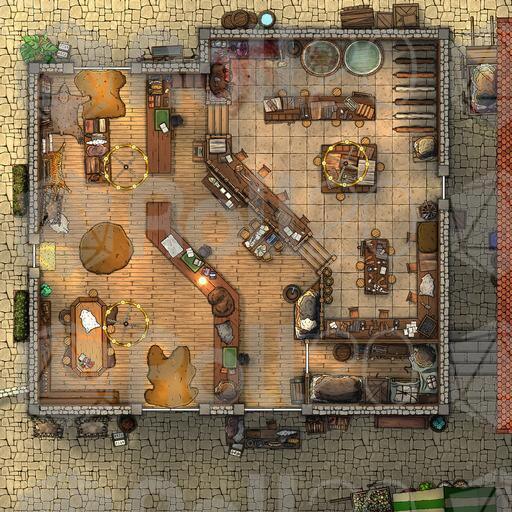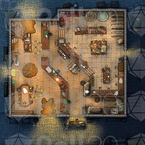 ➤ Vintner's Delight. [20x30] Secretive brandy lounge disguised as a warehouse; patrons descend to a cozy lounge with enchanted music. [🌓 Night & Day Variants]